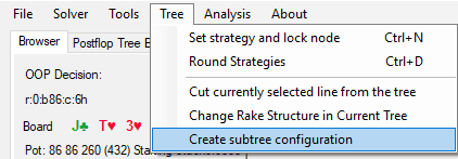 This is a feature I often use when evaluating a low frequency, big pot, big stacks line I’ve taken – such as single raised pot overbet flop or check/raise flop. You’re happy with your flop heuristics, but you want much more detail and/or accuracy on how to play that range on the turn/river. You can sidestep letting the whole simulation run to more accuracy by creating a subtree configuration.